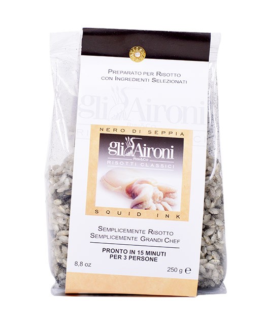 Lassen Sie ein Stück Nussbutter in einer Pfanne schmelzen. Geben Sie den Inhalt des Behälters hinein und lassen Sie den Reis kochen bis er leicht lichtdurchlässig wird. Während Sie rühren schenken Sie Weißwein ein. Wenn die Flüssigkeit komplett absorbiert ist geben Sie nach Gefühl zwei und einhalb weitere Tassen lauwarmen Wasser hinzu. Dann warten Sie einige Minuten bis ihr Tintenfischrisotto eine cremige Konsistenz hat und nehmen ihn von Herd. Zum Schluss geben Sie ein wenig Nussbutter, Salz und Parmesan hinzu und lassen Sie ihn eine Minute lang ziehen.